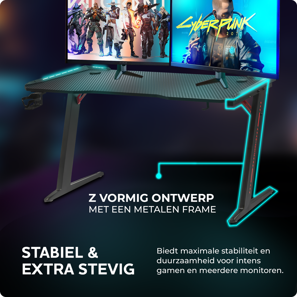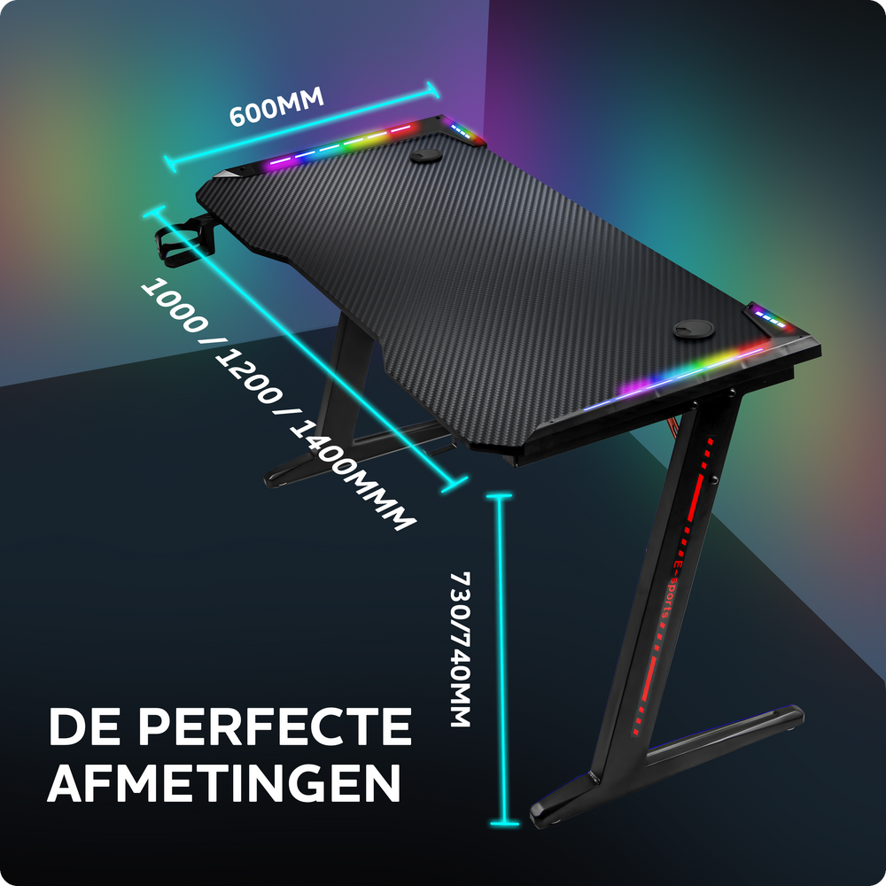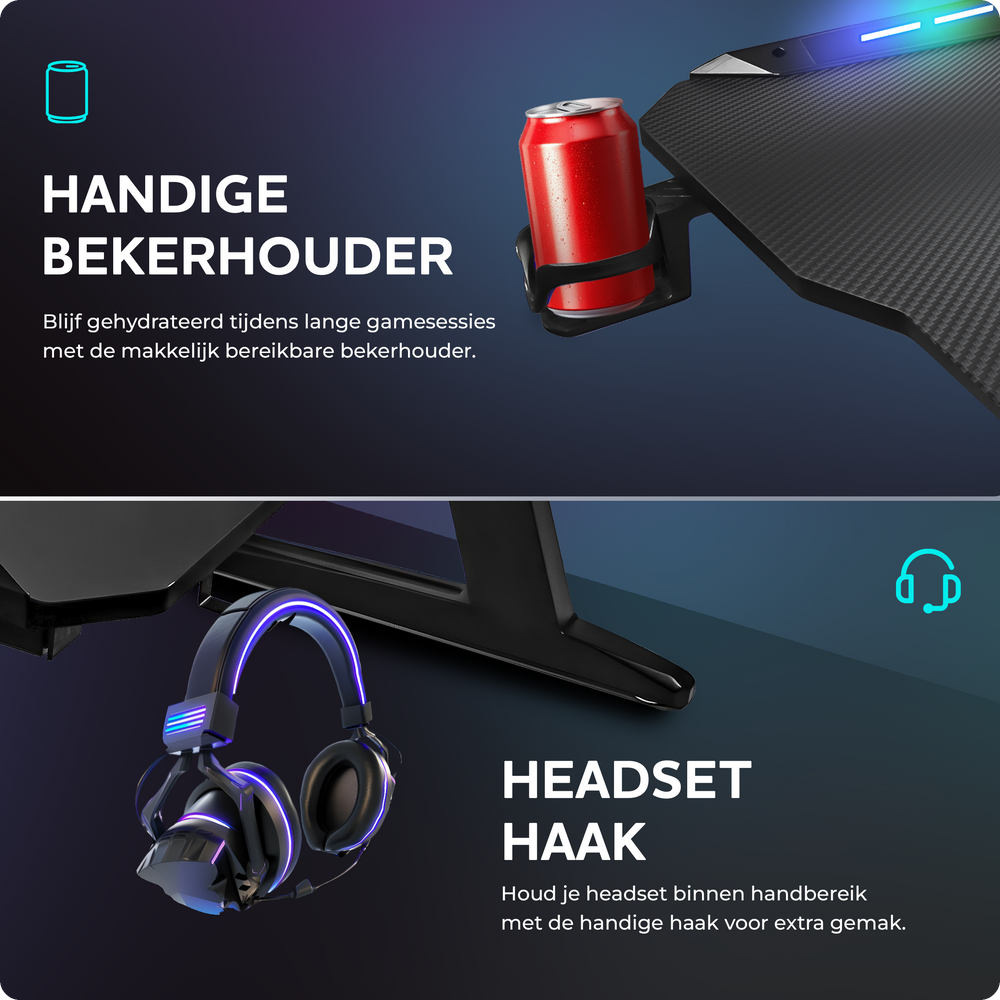 Met dit bureau creëer je een comfortabele gameplek waar je urenlang kunt genieten van je favoriete spellen, met alles binnen handbereik. En dankzij de LED-verlichting en coole uitstraling voegt het ook nog eens een extra dimensie toe aan je gamingomgeving.