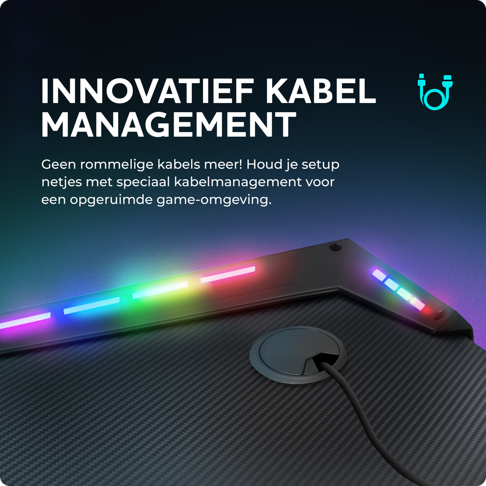 Het unieke ambi-light effect van dit gamingbureau voegt een extra dimensie toe aan jouw speelomgeving. Met geïntegreerde dual-side LED-verlichting, die niet alleen jouw bureau verlicht maar ook de muur eromheen, geniet je van een totaal meeslepende ervaring. Met maar liefst 360 opties voor LED-verlichting kun je de sfeer aanpassen aan jouw stemming en spelvoorkeur.